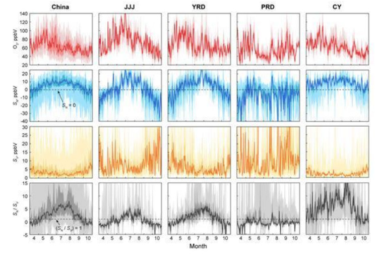 中国各地的地表臭氧峰值大多出现在5月,这可能受到长距离输送和平流层侵入的影响。除了珠三角地区,SN(臭氧浓度随NOX排放变化的一阶灵敏度)的峰值多发生于夏季,同时SV(臭氧浓度随VOCs排放变化的一阶灵敏度)多表现为谷值。这应当归因于夏季强烈的太阳辐射,使NO2的光解在臭氧生成的贡献中占据了主导地位,从而抑制了VOC的敏感性。SN与SV的比值多在夏季达到峰值,但珠江三角洲的SN/SV比率几乎为负值,无明显峰谷分异。