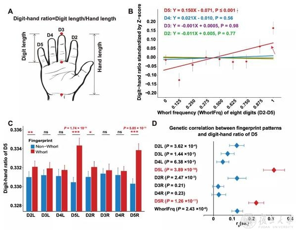 为进一步验证胚胎和胎儿肢体发育可能影响指纹花纹类型的假设,团队又检测了指纹模式与肢体相关表型(即手表型)之间的相关性,发现指纹花纹与手指长度比例之间广泛相关,并具有共同遗传基础。比如,小指相对越长,掌长相对越短,双手斗型花纹越多;而食指远端指节(指纹形成处)相对越长,斗形花纹则越少。