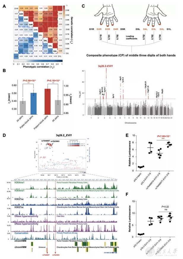 团队发现,在3q26.2 区域临近EVI1基因的变异位点与中间三枚手指指纹的复合表型显著相关。由此,也为前人提出的“花纹间影响”(pattern influence),即本研究提到的”指纹模块现象“(pattern block),提供了表型组学和遗传学解释。
