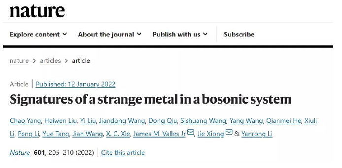 2022年1月12日,国际著名期刊《Nature》发表了我校题为《玻色子体系中的奇异金属态》(Signatures of a strange metal in a bosonic system)的研究论文,首次在高温超导体中发现并证实了玻色子奇异金属。该工作是我校电子薄膜与集成器件国家重点实验室李言荣院士团队为主完成的,博士生杨超为第一作者,熊杰教授为第一通讯作者。这是该团队继2019年在《Science》上首次报道实验发现量子金属态后,在量子科技领域取得的又一重大发现。