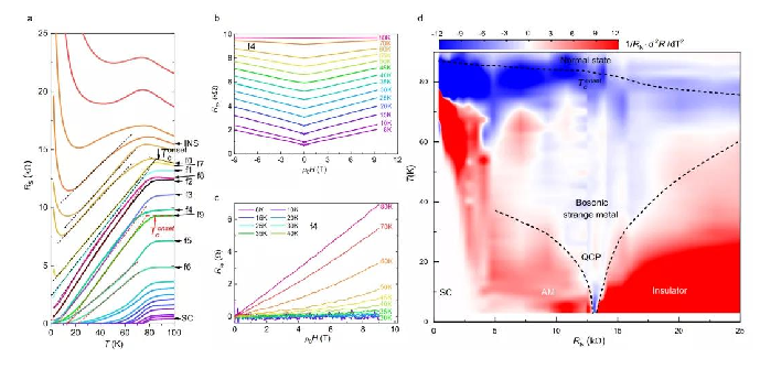 YBCO纳米网孔薄膜中量子金属-绝缘体量子相变点附近的奇异金属态(a)输运特性曲线,(b)线性磁电阻曲线,(c)霍尔电阻Rxy随温度的变化曲线,(d)玻色子奇异金属相图