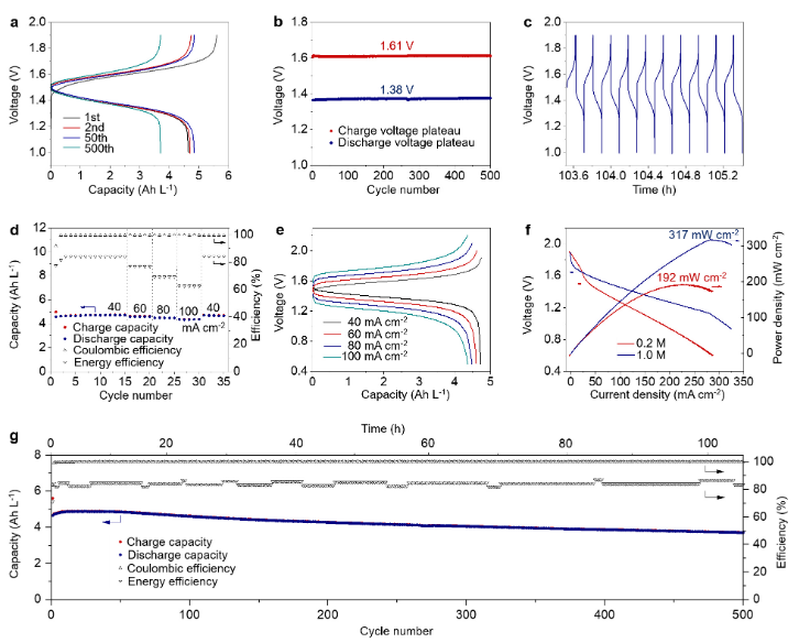 图2. 0.2 M Pyr-TEMPO / 0.1 M [PyrPV]Cl4的水系液流电池性能。