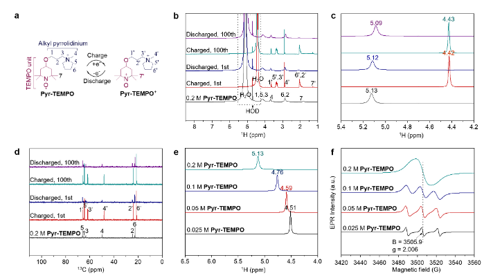图4. Pyr-TEMPO在充放电过程中的循环可逆性及其与水的相互作用。