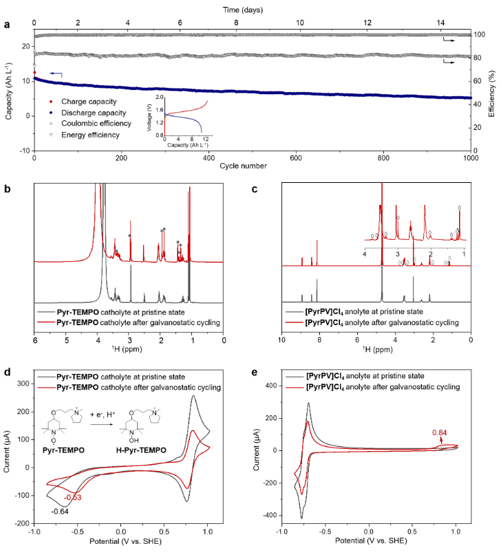 图3. 0.5 M Pyr-TEMPO / 0.25 M [PyrPV]Cl4的长循环电池性能及衰减机理分析。