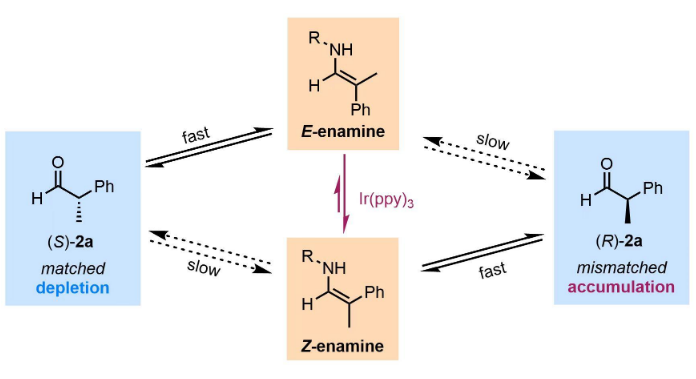 该团队通过系统深入的实验分析和理论计算,厘清了去消旋化的机理,提出了去消旋化手性合成的全新路径(图2):在S-构型手性伯胺催化下,S-醛优先与催化剂形成E-烯胺,随后被光异构化生成Z-烯胺,后者快速水解质子化生成R-醛。构型匹配的S-醛不断被消耗,不匹配的R-醛不断富集,从而实现了去消旋化。在此过程中,光异构化提供了去消旋化反应的驱动力,适当的苯甲酸添加剂调节了达到平衡的速率,伯胺催化剂的立体专一性保证了产物的高对映选择性。