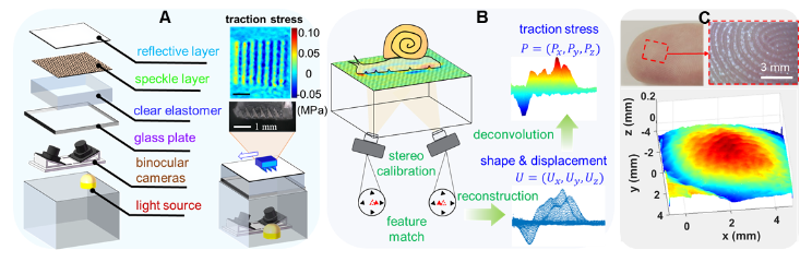 图1.界面三维接触应力测量方法示意图;(A)测量装置的多层结构示意图;(B)接触表面变形场测量和应力场计算原理图;(C)手指的接触形状表征