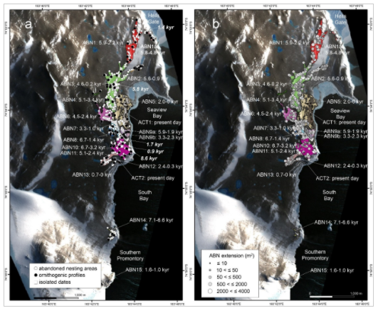研究团队提出废弃巢区年代和面积测定相结合的方法,系统恢复了全新世以来的企鹅种群数量变化和巢区迁移过程。发现距今7000-3000年间,恩克斯堡岛的种群数量大致呈增加趋势,在5500-5000和4000-3500年达到峰值。在3500-3000年的短暂下降后,企鹅种群3000-1500年间显著扩张,与南部斯科特海岸大规模聚落废弃相对应。罗斯海斯科特海岸在距今5-4千年遍布企鹅繁殖地,却在距今3-2千年大规模废弃,关于废弃的原因长期以来存在“变冷说”和“变暖说”两种观点。此前,谢周清课题组在企鹅粪土层中找到关键证据,提出“新冰期”变冷条件下区域海冰扩张和局部地形影响下的风和积雪增加是导致斯科特海岸废弃的主要原因,解答了争论已久的“企鹅消失之谜”,并系统重建了罗斯海历史时期企鹅繁殖地分布的演变过程(图2)(Quaternary Science Reviews, 264, 2021)。在此基础上,本研究提出特拉诺瓦湾冰间湖提供的无冰环境使其恩克斯堡岛在近岸海冰扩张的时期接纳了来自斯科特海岸的迁徙企鹅种群,致使企鹅数量大幅增加,成为了区域企鹅种群的宝贵避难所。论文指出,近几十年罗斯海的近岸海冰呈现出增加趋势,因此恩克斯堡岛等有冰间湖分布的区域将会对企鹅种群的延续发挥更为关键的作用。