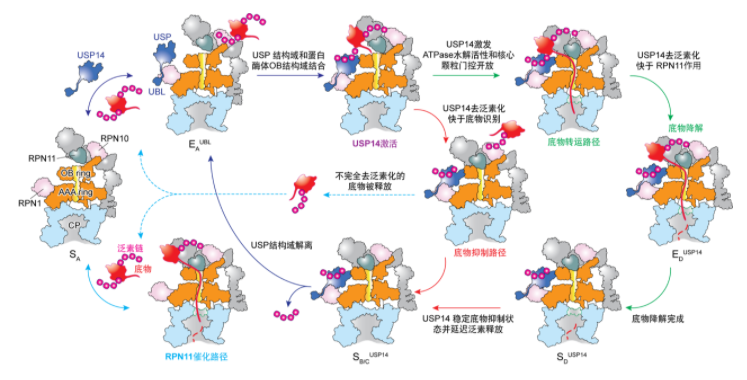 蛋白质降解调控是极其重要的基本生物化学过程,在细胞周期、信号转导、免疫响应、基因调控、新陈代谢、神经退行、癌症肿瘤、病毒感染以及蛋白毒性响应等主要细胞分子过程中发挥着关键的调控作用。在真核细胞中,绝大部分胞内蛋白都是通过泛素蛋白酶体途径(Ubiquitin-proteasome pathway),经过泛素化标记被蛋白酶体全酶降解的。2004年,Aaron Ciechanover,Irwin Rose和AvramHershko三位科学家因“对该泛素化通路介导蛋白质降解的历史性发现”被授予诺贝尔化学奖。蛋白酶体全酶,又称为26S proteasome,是由中间一个圆柱形20S核心颗粒和两端覆盖的一个或两个19S调节颗粒组成。19S包含一个环形异源六聚体马达——AAA-ATPase,通过多个协同ATP水解模式调控蛋白酶体降解泛素化底物。蛋白酶体功能紊乱与人体多种疾病相关,如癌症、神经退行性疾病和免疫疾病等。蛋白酶体是美国食品药品监督管理局(FDA)批准的多种治疗癌症的上市小分子药物的直接靶标。在正常细胞中,蛋白酶体的功能受到多个水平的严格调控。去泛素化酶USP14是最主要的蛋白酶体调控分子,被认为是一个潜力巨大的治疗癌症和神经退行性疾病的重要靶标,其小分子抑制剂曾进入过美国一期临床研究,但围绕USP14功能机制的一系列悬而未决的关键问题极大地限制了其靶向药物分子的开发和临床应用。USP14通过结合26S而被激活,然后以毫秒的时间尺度剪切底物上的泛素链;但其如何被蛋白酶体激活并调控蛋白酶体功能,一直是全球研究机构和生物制药领域期待解决的关键科学问题。