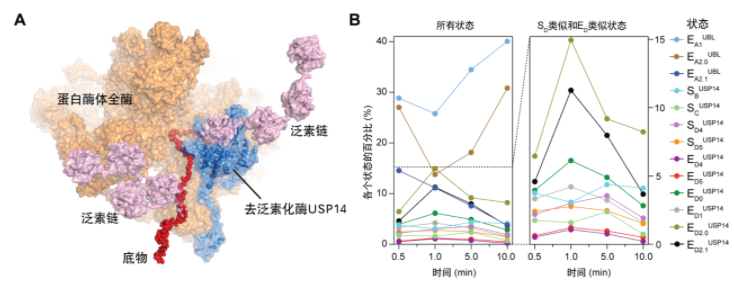 (A) USP14调控下蛋白酶体复合体降解多泛素化底物的原子结构模型之一;(B) 时间分辨率冷冻电镜解析13种中间态的统计分布随蛋白质降解进程的时间演化(Youdong Mao, CC BY 4.0)