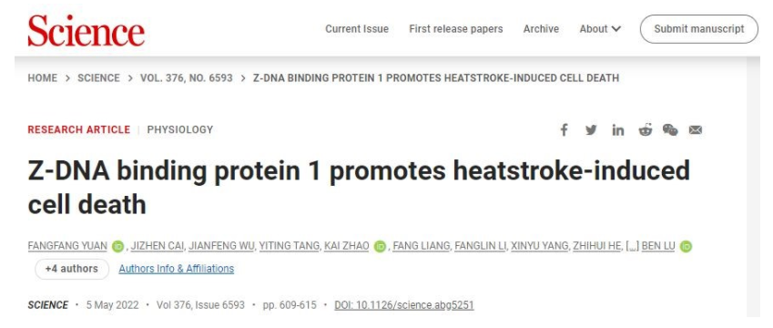 5月5日,中南大学湘雅三医院吕奔教授团队在国际学术期刊Science上在线发表了题为“Z-DNA binding protein 1 promotes heatstroke-induced cell death”的研究论文,揭示了热射病(又称“重度中暑”)的重要致死机理——高体温通过ZBP1蛋白诱发过度的程序性细胞死亡,进而导致危及生命的弥散性血管内凝血(DIC)与多脏器损伤。该论文的第一单位为中南大学湘雅三医院。中南大学博士后袁芳芳为第一作者,吕奔教授为通讯作者。