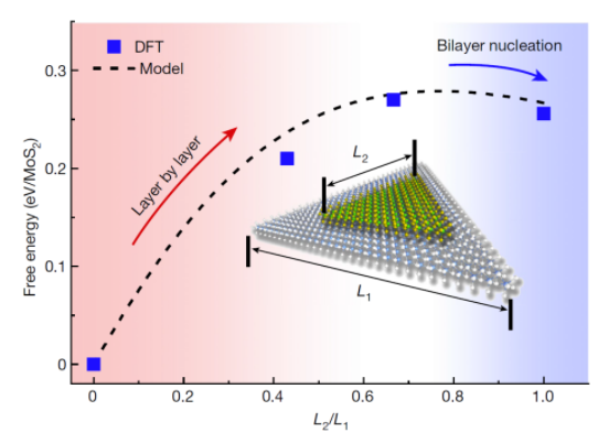 图1. 单、双层MoS2生长的热力学竞争趋势。