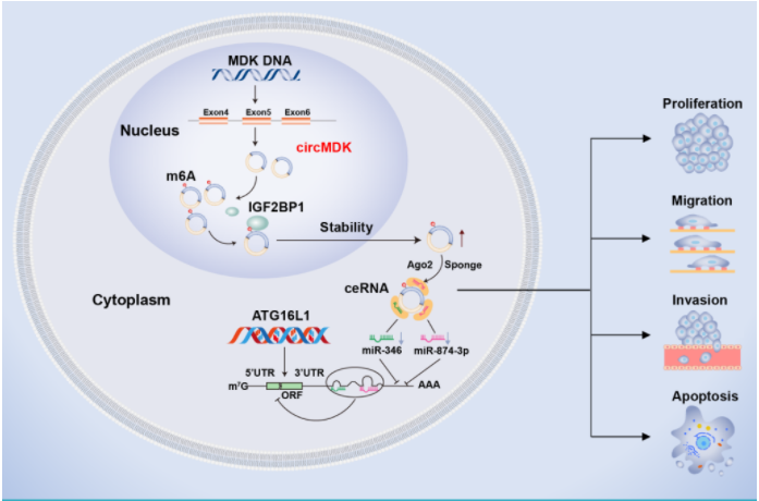 环状RNA是一类内源性非编码RNA,因其特殊的环状结构比常规的RNA更稳定。研究表明,环状RNA参与了肝癌的发展、调节细胞增殖、肿瘤侵袭和转移等。夏赞贤团队通过高通量测序及生物信息学数据挖掘等策略,从肝癌组织中鉴定出一批差异表达的环状RNA并进行了深入的研究,获得了一系列原创性的发现。在论文中,他们发现环状RNA circMDK在肝癌组织和细胞中表达水平较高,并且circMDK存在m6A甲基化修饰,circMDK能招募m6A Reader蛋白IGF2BP1,提高转录水平的稳定性,这可能是circMDK在HCC中上调的部分原因。生物信息学分析以及实验验证,circMDK可通过海绵吸附miR-346和miR-874-3p共同靶向ATG16L1,从而促进肝癌的增殖、侵袭和迁移,这些研究为了解circMDK在肝癌中的临床意义和调控机制提供了理论与实验基础。