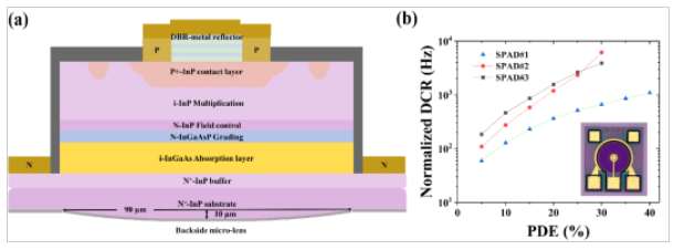 王亮教授研究团队通过调整MOCVD的温度、V/III比、掺杂浓度等生长参数实现低缺陷密度和高掺杂精度的外延结构生长。在SPAD器件结构的基础上提出并设计了新型的宽谱(全光通信波段)全反射镜,即金属—分布式布拉格反射镜用以提升SPAD芯片的光电吸收效率。研究团队所制备的12μm窗口的低暗计数SPAD,在温度233 K及 10%的探测效率下具有127 Hz的超低本征暗计数,比国外同类产品低一个量级,拥有更优的器件性能,此芯片可满足量子通信等应用的单光子探测的使用需求并可替代进口器件。