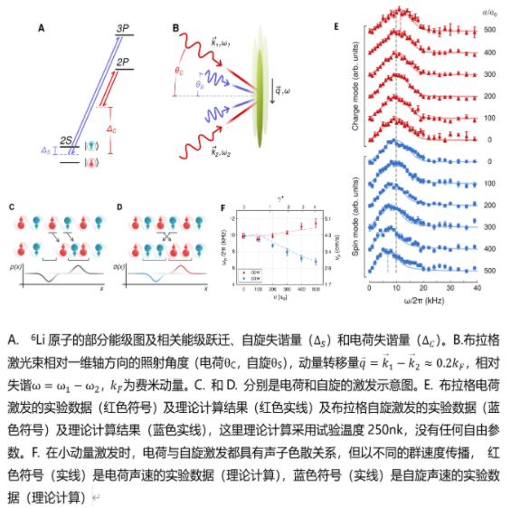 2020年至今,研究团队进一步合作通过囚禁一维超冷原子实验成功地验证了这一重要的量子多体物理的普适规律。在囚禁的一维超冷6Li费米原子中,他们对电荷DSF的测量选择了精细能级|1> and |2> (|F = 1, MF = ±1/2)作为自旋态,2P3/2态为激发态,对自旋DSF的测量选择了精细能级|1> and |3> 作为自旋态,3P3/2态为激发态,参见图一(A-D)。他们通过布拉格光分别激发电荷与自旋密度波,并调控不同相互作用强度测量出其相应的电荷和自旋的布拉格谱,参见图一(E)。在不同相互作用下布拉格谱的峰值给出了相应的电荷和自旋的传播声速,参见图二(F)。在理论方面,他们通过复杂的三维粒子数分布获得了一维管状系统中的密度分布,再进一步利用一维相互作用费米气体杨-高丁模型精确解和朝永-拉亭戈液体理论精确计算了囚禁冷原子电荷与自旋的DSF。考虑了电荷激发谱中的曲率修正和自旋激发谱中的反向散射引起的非线性效应后,理论与实验结果非常吻合。这在国际上首次通过超冷原子实验验证了自旋-电荷分离现象的朝永-拉亭戈液体理论,并给出非线性拉亭戈液体理论的有力证据。本项工作不但展现了量子多体物理中的典范,并且为将来基于原子分子和光物理的精密测量科技提供了新的思想。