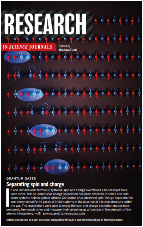 相关研究成果以“具有可控相互作用一维费米气体中的自旋-电荷分离“Spin-charge separation in a 1D Fermi gas with tunable interactions”为题,发表在《科学》 (Science)杂志上。在本项工作中管习文科研团队负责理论计算及分析,管习文与兰迪·休利特教授为共同通讯作者。