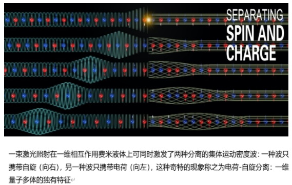 粒子间复杂的相互作用和系统丰富的内部自由度通常给系统物理特性的描述带来巨大挑战。在一维量子多体物理中,朝永-拉亭戈液体理论通常被用来描述一维多体系统的低能普适行为。一维相互作用费米子的低能激发通常会分裂成两支独立的朝永-拉亭戈液体,它们分别刻画携带自旋和电荷的分数化准粒子的集体运动,这种现象被称为自旋-电荷分离,参见图一。它是一维量子多体物理中独特的普适规律。尽管这方面的研究有40多年的历史,人们也在一维固体材料发现一些与自旋-电荷分离现象相关的证据(evidence),然而对于这种现象至今缺乏确定性(conclusive)的实验验证,理论如何表征自旋-电荷分离现象以及相关实验的调控方法都是公认的世界性难题。
