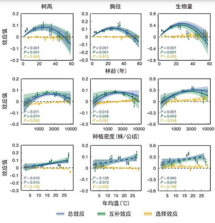 图3. 混交林的增产效应随林龄、种植密度和温度的变化