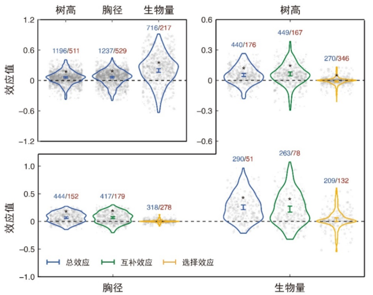 研究发现,混交林的树高、胸径和生物量均显著高于纯林,平均增加量分别为5.5%、6.8%和25.5%。分析表明,这种增产效果主要由种间互补作用所致(见图2)。进一步分析发现,物种性状组成是影响增产效果的关键因素:不同叶型(针叶和阔叶)混交比单一叶型混交的增产效果更好;不同叶生活史(落叶和常绿)混交比单一生活史混交的增产效果更好;不同养分获取策略(固氮和非固氮)混交与单一养分获取策略混交的增产效果相似。