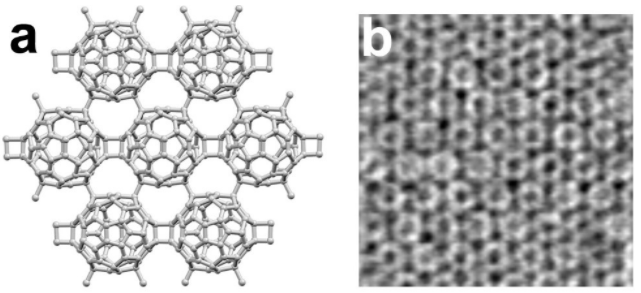 b:单层聚合C60STEM图片,C60笼簇在STEM图片中显示为圆环。