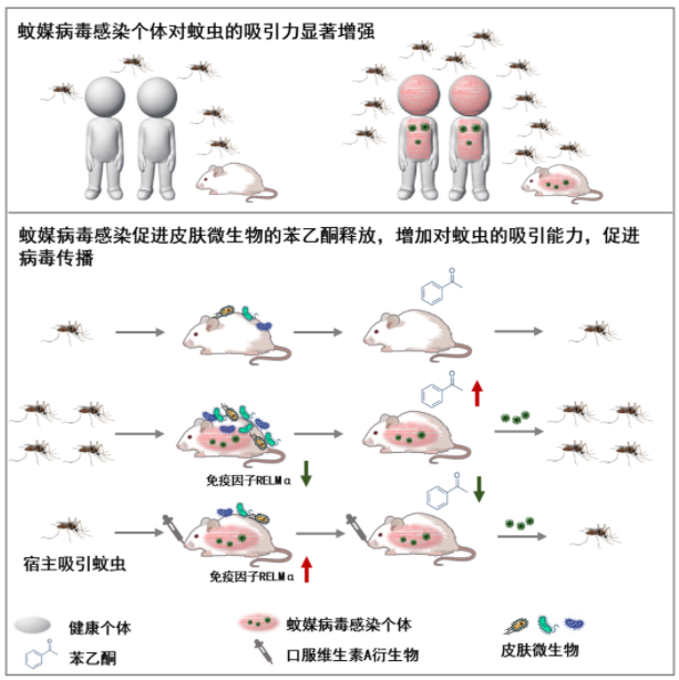 图2.通过补充维生素A类药物,重塑感染个体皮肤微生物的苯乙酮释放,降低蚊媒病毒传播循环效率
