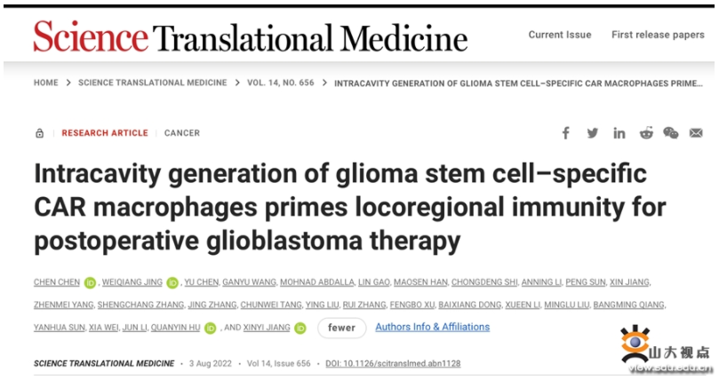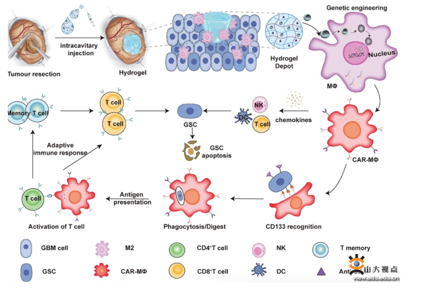近日,山东大学药学院姜新义教授团队与美国威斯康辛大学—麦迪逊分校药学院、山东大学齐鲁医院等多家单位合作构建了一种基因纳米载体—可注射水凝胶超结构递药系统,并成功应用于恶性脑胶质瘤动物模型的术后免疫治疗。研究成果以“Intracavity generation of glioma stem cell-specific CAR macrophages primes locoregional immunity for postoperative glioblastoma therapy”为题发表于Science Translational Medicine。山东大学姜新义教授和美国威斯康辛大学-麦迪逊分校药学院Quanyin Hu教授为共同通讯作者,山东大学药学院2018级博士陈晨、齐鲁医院博士后荆卫强为第一作者,山东大学为第一作者和第一通讯作者单位。