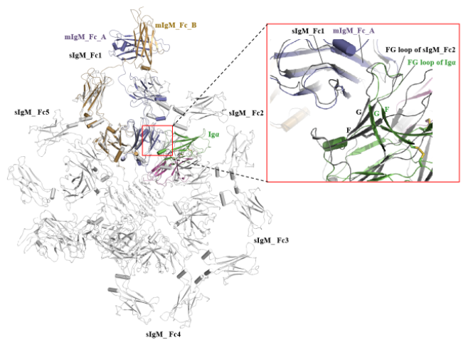 人类B细胞受体有5种亚型,在该研究中,该课题组解析了人IgG和IgM两种亚型的BCR复合物结构,BCR复合物结构包含了一个膜结合形式的免疫球蛋白(mIg)同源二聚体,用于识别抗原,以及一个膜结合形式的Igα/β(CD79α/CD79β)异二聚体,用于信号传递(化学计量比为1:1)。其中,mIg二聚体包含了Fab和Fc结构域、连接肽(CPs)和跨膜(TM)螺旋,Igα/β结构由两个胞外Ig样结构域、CPs和TM螺旋组成。IgG和IgM-BCR复合物的组装分别由胞外的IgG-Cγ3和IgM-Cμ4与Igα/β的Ig样结构域,以及连接肽、跨膜螺旋承担。课题组通过两个亚型的结构比较发现,mIgG和mIgM的跨膜螺旋区通过保守的疏水和极性作用与Igα/β 结合。相比之下,在胞外区域,IgG-Cγ3和IgM-Cμ4分别通过“首尾相连”(head-to-tail)以及“肩并肩”(side-by-side)的模式与Igα/β的Ig样结构域结合,其中,Igα的CD loop 旋转了90度,分别与Cγ3和Cμ4结构域结合。结构上观察的不同亚型组装模式是否和活性有关值得进一步研究。