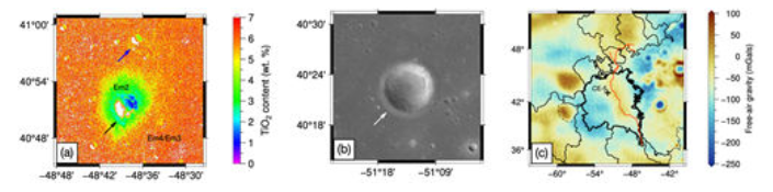 图2.(a)典型穿透坑(黑色箭头)与未穿透坑(蓝色箭头)的钛含量分布图。(b)典型部分淹没撞击坑的光学影像,其中白色箭头指示了撞击坑溅射物与玄武岩的边界。(c)研究区域的无空气重力异常,由此可进一步计算得到有效密度谱。