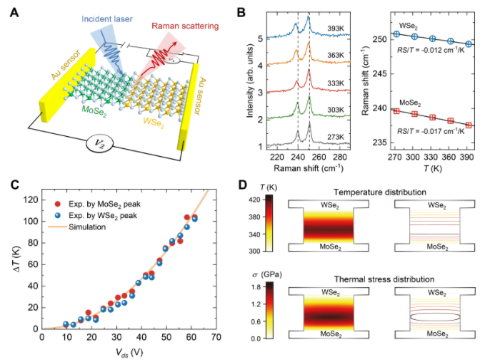 图4. 大偏置电压条件下MoSe2-WSe2异质结器件的界面温升测量