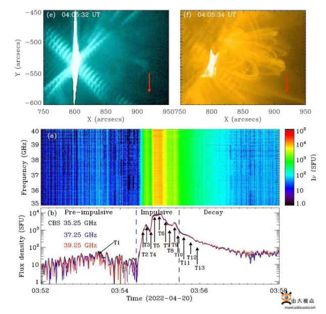 上图所示为2022年4月20日的X2.2级耀斑期间,由空间电磁探测技术实验室自研设备观测到的太阳毫米波动态频谱及相关数据。在耀斑脉冲相期间可观测到三波峰值;在最高峰即第二峰,35-40 GHz区间射电流量最高可达9300 SFU,相应辐射流量随频率增加而增加,说明此时回旋同步辐射谱的翻转频率(νt)超过35甚至40GHz;在另外两峰期间,翻转频率略小,仍主要位于20至35GHz之间。基于本设备及日本野边山观测站在17GHz及更低频率上的数据,可很好限制该耀斑脉冲相厘米-毫米波辐射谱形参数,这在以往是无法实现的。