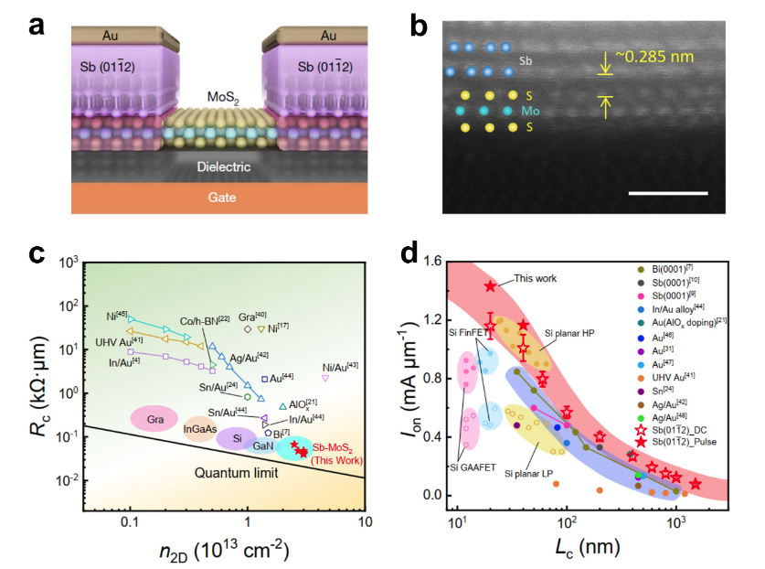 图2. Sb(01-12)-MoS2接触器件模型、高分辨STEM原子图像以及接触电阻和电流密度的对比。