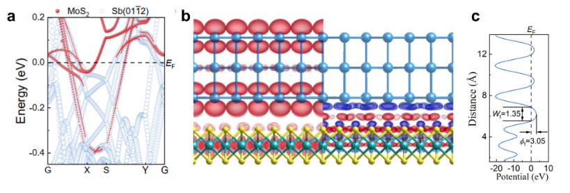 图1. Sb (01-12)-MoS2接触的能带杂化、近费米能级波函数和差分电荷密度分布和垂直方向静电势变化曲线。