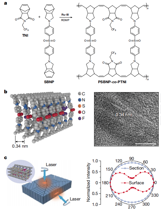 黄兴溢团队设计了一种含氟缺陷的双链结构共聚物PSBNP-co-PTNI,该共聚物通过π-π堆叠作用自组装成高度有序阵列。通过偏振拉曼光谱测试发现,共聚物薄膜的偏振信号在平面上呈各向同性,在断裂面上呈各向异性,表明有序阵列平行于表面,因此,电介质薄膜在垂直平面方向表现出1.96 ± 0.06 W/(mK)的高导热系数。