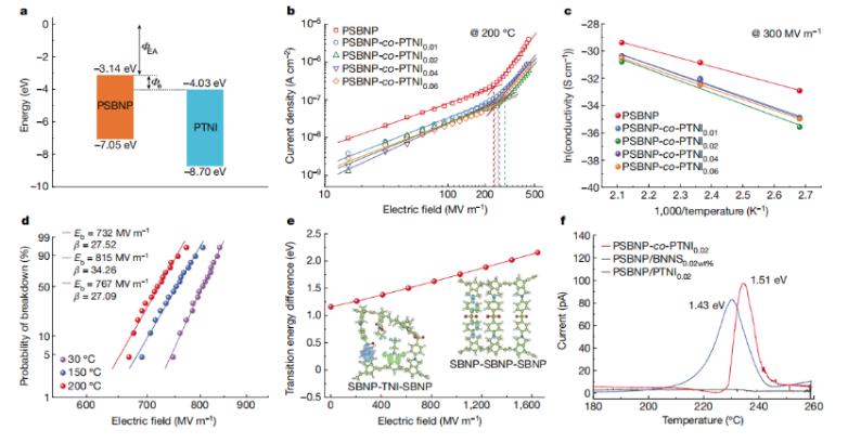 密度泛函理论分析和热刺激电流实验表明,PSBNP和PTNI嵌段间存在深度为1.51 eV的电荷陷阱,且随着外电场强度增加,电荷陷阱深度进一步增大。在PSBNP有序阵列中引入2 mol%的PTNI分子,共聚物PSBNP-co-PTNI0.02表现出最优的电气绝缘性和最高的电击穿强度。