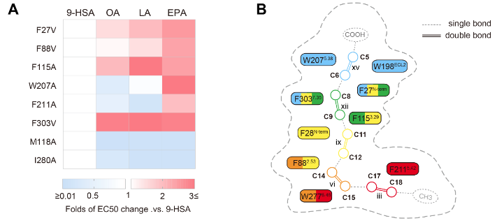 A,Omega-3鱼油受体如何识别不同的饱和、不饱和脂肪酸以及合成化合物?双键在自然界上普遍存在,哺乳动物是否有一个既定的系统识别这些双键修饰?如果存在的话,单键和双键的区别如此细微,如何精细调控受体蛋白,并转化为特定的生物信号传导?