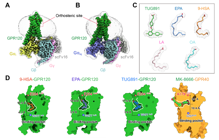 A-B, Omega-3鱼油受体-Gi/Giq冷冻电镜结构;C, 多种不同配体的电镜密度;D, Omega-3鱼油受体(绿色)的配体结合口袋与其他脂肪酸受体(黄色)配体结构口袋的比较。
