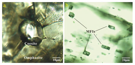 图一a.绿辉石(Omphacite)中的柯石英(coesite)包裹体 b.绿辉石中呈负晶型的多相流体包裹体(显微照片)