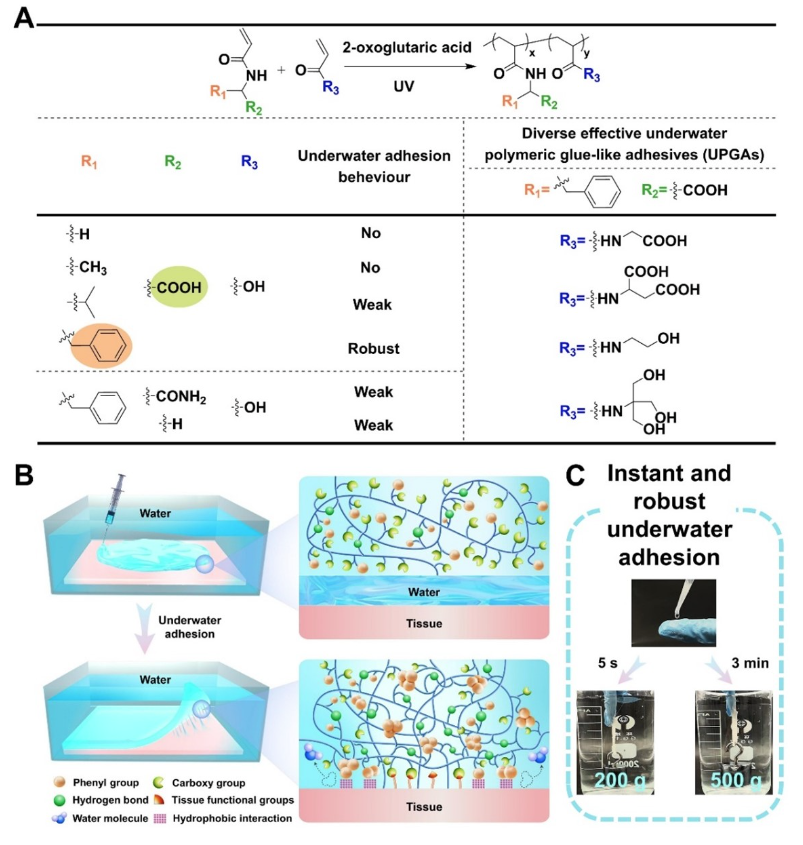 图1.水引发固化胶水状聚合物水下组织粘接剂的设计策略