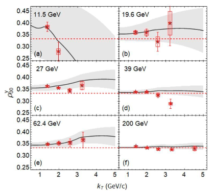 图2.ϕ介子自旋排列对横向动量的依赖,红色五角星为实验测量结果,黑色实线以及阴影区域为模型计算得到的结果与误差范围。