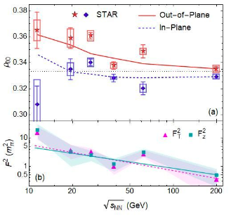 图1.不同碰撞能量的金核与金核碰撞中,ϕ介子自旋排列的实验测量结果(图a)以及提取得到的ϕ矢量场横向与纵向涨落的强度(图b)。
