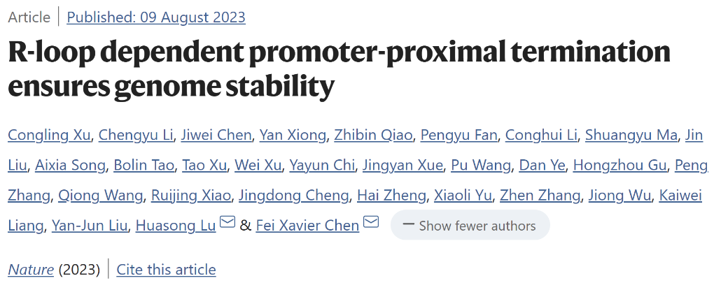 2023年8月9日,复旦大学生物医学研究院/附属肿瘤医院陈飞课题组与浙江大学陆华松课题组合作,在Nature杂志以长文形式发表了文章R-loop dependent promoter-proximal termination ensures genome stability (《R-loop依赖的启动子近端转录早期终止维持基因组稳定性》)。该研究首次发现了INTAC复合物与单链DNA识别复合物SOSS稳定结合并形成SOSS-INTAC复合物;该复合物以凝聚体的形式通过调控细胞内R-loop的水平维持基因组稳定性。