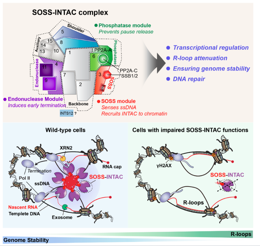 综上所述,该研究论文首次鉴定了一个基因转录和基因组稳定性调控复合物SOSS-INTAC,并揭示了其在基因转录调控和基因组稳定性维持中的“双重质控”功能,是基因转录与基因组稳定性交叉研究领域的又一突破性发现。