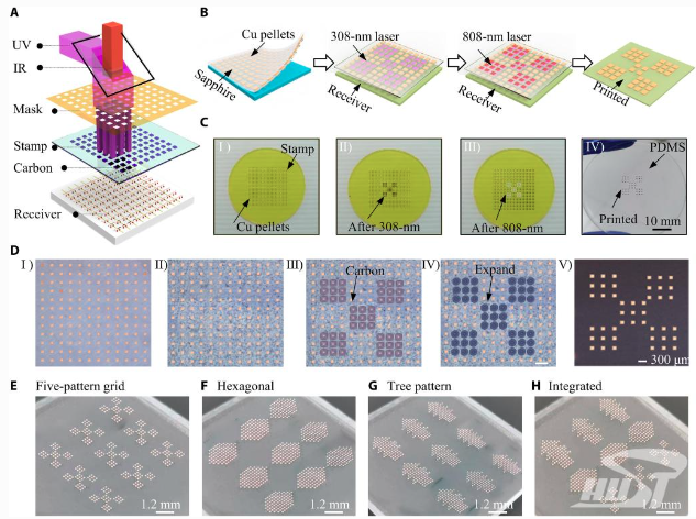 为了验证LaserPPT技术具有实现可编程、大面积微尺度芯片的选择性集成的功能。研究团队通过自主研制的巨量转移实验平台(iGreatTransfer),将微尺度的“芯片”批量地集成在无粘附性接收基板上,最终形成“五宫格”、“蜂窝形”、“树状形”等转移图案。该工作进一步将MicroLED芯片集成到柔性电路板,验证了了激光投影接近式技术可以成功集成MicroLED柔性显示器件能力。