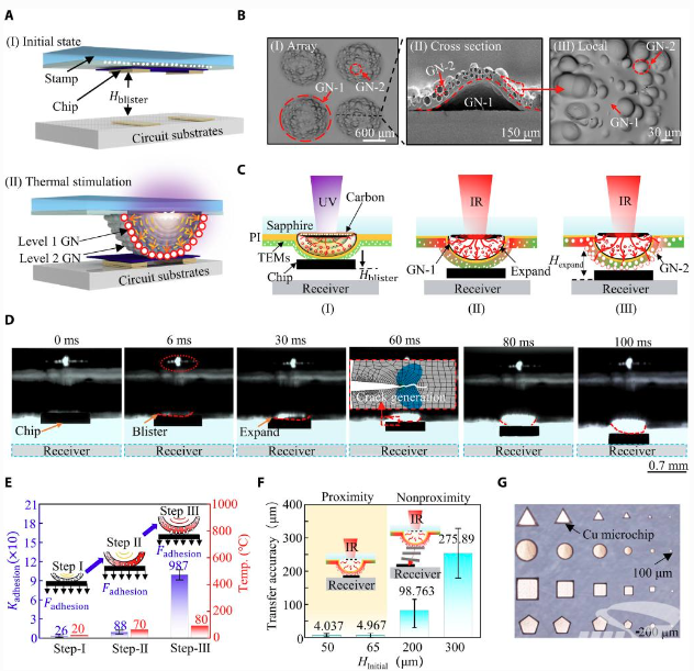 新闻网讯(通讯员 卞敬)10月27日,国际权威期刊《Science Advances》上在线发表了题为“Laser-driven hierarchical "gas-needles" for programmable and high-precision proximity transfer printing of microchips(激光驱动多级气体顶针用于可编程、高精度的接近式微型芯片转印)”的最新研究成果。我校智能制造装备与技术全国重点实验室为论文第一完成单位,机械学院博士生陈福荣为第一作者,黄永安教授和团队合作教师南京邮电大学卞敬博士为共同通讯作者。机械学院博士生盖梦欣、余海洋,许章宇,硕士生孙宁宁、刘磊等参与研究。