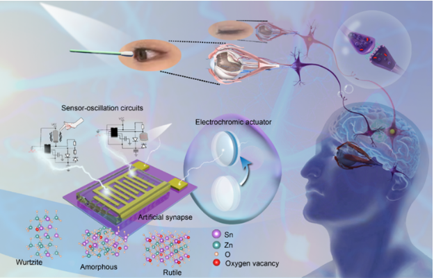 徐文涛教授团队研发的人造智能角膜,通过人造反射弧重建“原生感觉”。团队分别以传感器振荡电路、氧化锌锡(ZTO)纤维基人造突触和电致变色器件作为感受器、处理核心和效应器,实现了对外界机械和光刺激的编码、信息处理以及透射光的调节。团队使用数字对准的ZTO纤维作为人造突触的沟道,探究出了调控长、短程突触可塑性的新方法。ZTO纤维不仅长而连续、绿色无毒、成本低廉、光学性能优异(透过率>99.89%,雾度<0.36%),而且晶体结构精准可调,进而可定制长、短程突触可塑性,并应用于联想学习和加密通信。