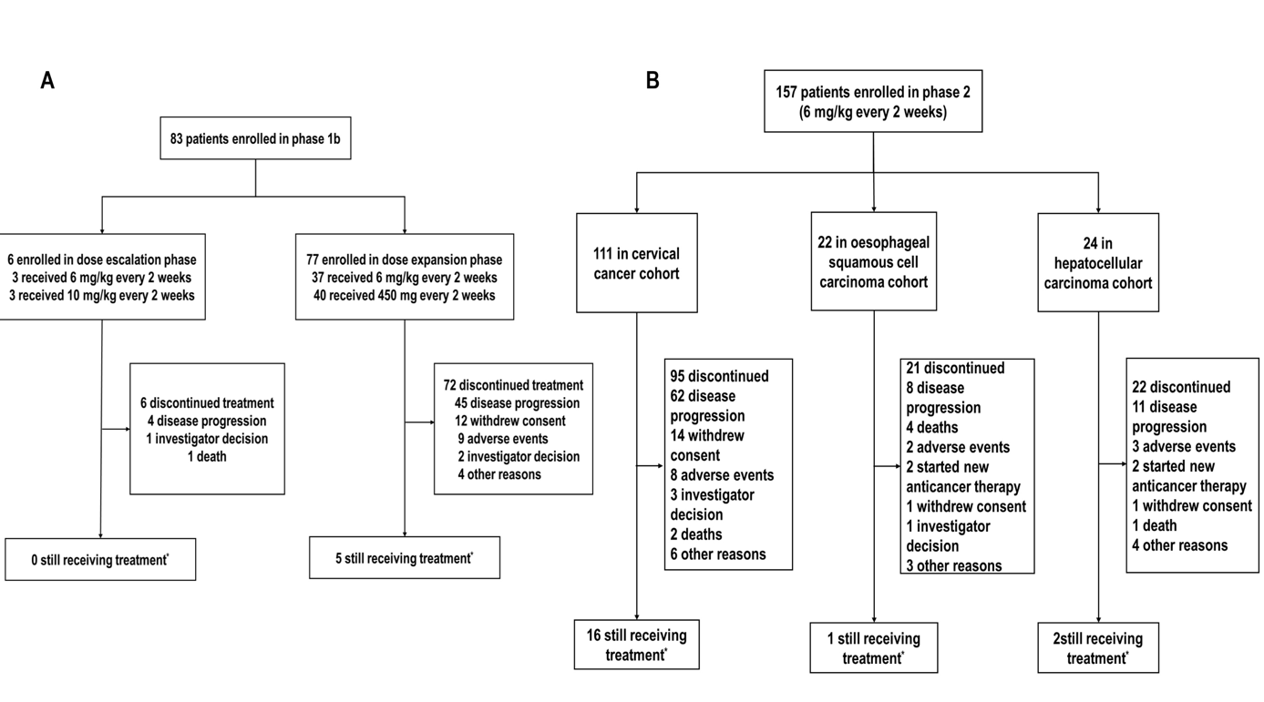 研究总计入组240例患者,接受卡度尼利单药治疗,其中Ib期纳入83例晚期实体瘤患者;Ⅱ期纳入157例患者。Ib期剂量递增阶段未发生剂量限制性毒性,整体安全性良好:3-4级治疗相关不良反应(TRAE)发生率为27.9%,最常见的≥3级TRAE包括贫血、食欲下降、中性粒细胞计数下降、输液相关反应等。II期临床中单药的抗肿瘤活性提高,生存获益显著。晚期宫颈癌队列,客观缓解率(ORR)为32.3%,14.1%(14例)达完全缓解(CR),18.2%(18例)达部分缓解(PR),中位OS尚未达到,18个月的OS率为51.2%;晚期食管癌队列,中位OS为9.4个月,6例患者删失在14个月以后;晚期肝癌队列,中位OS尚未达到,18个月的OS率为56.7%。