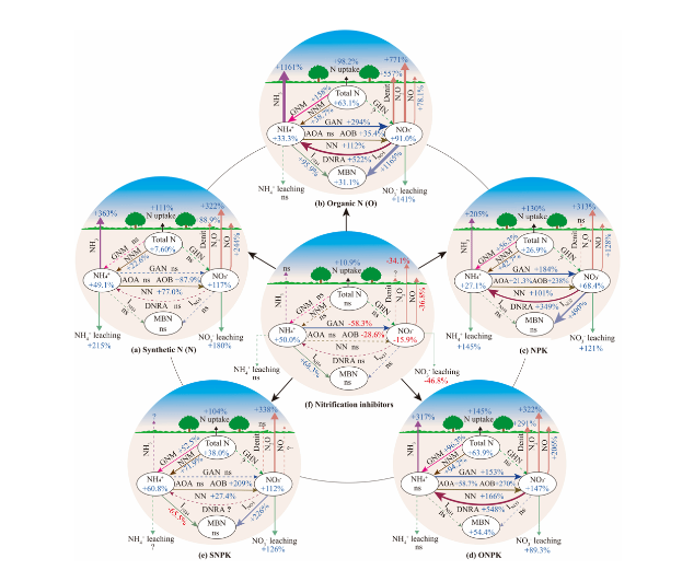科学的氮素综合管理措施是可持续农业生态系统中氮素保留的重要措施。通过整合研究全球范围内5448组田间数据,系统评估4种常见的氮管理措施(配方施肥、施用有机肥、有机无机配施及配施硝化抑制剂)对全球生态系统氮循环的影响后发现,相比单施氮肥,施用有机肥和配方施肥可以通过增加微生物的生物量来促进土壤硝酸盐驻留;与不施肥相比,施用有机肥和平衡施肥也能促进土壤氮素淋溶和气体排放。然而,硝化抑制剂刺激了土壤铵的保留和植物氮的吸收,同时减少了氮的淋溶和气体排放。研究指出,科学的应用氮素管理措施对于促进生态系统氮素保留和降低全球氮损失风险至关重要。