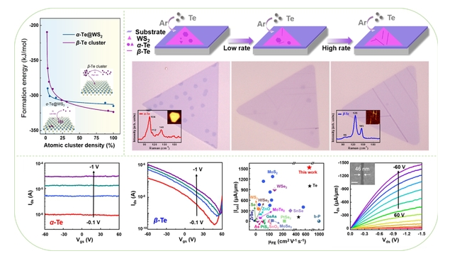 【东大新闻网2月21日电】(通讯员 周珺)近日,东南大学物理学院倪振华教授、吕俊鹏教授课题组利用原子簇密度和界面诱导的多重调控策略,通过理论结合实验,在二维碲烯(Te)材料中实现了原子级精准的相工程控制,相关成果以 “Phase-Engineered Synthesis of Atomically Thin Te Single Crystals with High ON-State Currents”(相工程合成具有高开态电流密度的原子级碲单晶)为题发表在著名刊物Nature Communications上。