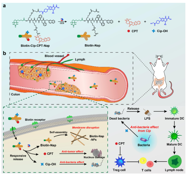 结直肠癌肿瘤内细菌能分解化疗药物,导致化疗耐药。为了克服细菌诱导的化疗耐药并增强抗肿瘤免疫反应,研究人员设计了一种具有自组装能力的新型分子Biotin-Cip-CPT-Nap,其包含四个功能部分:具有肿瘤靶向性的生物素Biotin、具有自组装能力的Phe-Phe(-Nap)序列、具有广谱抗菌活性的环丙沙星衍生物Cip-OH和化疗药物喜树碱CPT。在肿瘤细胞膜表面高表达的生物素受体介导的内吞作用和细胞内羧酸酯酶的催化作用下,其能够自组装形成纳米纤维,并释放抗生素环丙沙星衍生物(Cip-OH)和化疗药物喜树碱(CPT),提高局部药物浓度,分别杀死瘤内细菌和肿瘤细胞,克服了细菌诱导产生的耐药性,提高了抗肿瘤免疫反应。该工作为设计新型多功能的增效型前药提供了借鉴思路。