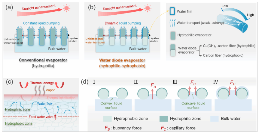 近年来,用于缓解全球水问题的界面太阳能驱动蒸发(ISDE)技术引起了研究者的极大关注。其中,ISDE系统的供水管理在有效的能量匹配中具有越来越重要的作用。传统系统中输入能量和所需能量之间的不匹配严重影响了转换效率。鉴于此,王成兵教授团队提出并设计了一种新型的“水二极管”光热蒸发器,得益于非对称表面润湿性梯度和单向水传输特点,该蒸发器的供水速度可以随着光强的增加而显著加快,表现出对光照强度的自适应能力。