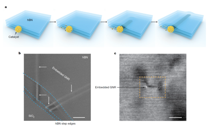 近日,上海交通大学史志文教授团队与合作者在Nature上发表题为“Graphene nanoribbons grown in hBN stacks for high-performance electronics”的研究论文。该研究开发了一种生长石墨烯纳米带的全新方法,成功实现了超高质量石墨烯纳米带在氮化硼层间的嵌入式生长,形成“原位封装”的石墨烯纳米带结构,并演示了所生长的石墨烯纳米带可用于构建高性能场效应晶体管器件。